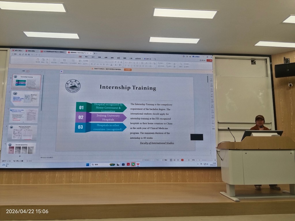 Ms. Gan elaborated on the specific requirements for internships. She detailed the list of required documents, including the Application Form for International Student Hospital Internship, copies of passport and visa, HSK Level 4 or above language certificate, health certificate, medical insurance proof, fee payment receipt, and the Confidentiality Commitment for International Interns. She also stated that the internship must last at least 48 weeks, and the internship hospital must be recognized by the Medical Council, Ministry of Health, or government authority of the respective country. Before the internship starts, students are required to submit the hospital’s Acceptance Letter or Office Order to the designated email (alumni@jju.edu.cn), submit the Mid-term Internship Evaluation Form by 25 March 2027, and after completing the internship, submit the Internship Appraisal Booklet and the Internship Certificate issued by the hospital. Ms. Jiang further supplemented the important notes for interns, including strictly observing the hospital's work schedule, following the arrangements of both the hospital and FIS, complying with medical procedures, showing respect to colleagues and patients, ensuring personal and medical safety, and adhering to the 24-hour duty system and leave request procedures. She also displayed samples of the required documents for reference.