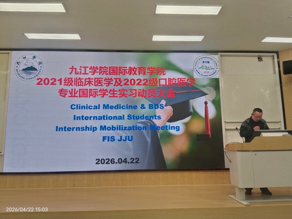 The Internship Mobilization Meeting has been held for the 2021 batch students . The meeting was attended by Ms. Zhu Xiaojing, Deputy Dean of FIS; Mr. Wang Bin, representative from Jiujiang University Affiliated Hospital and 150 students from the 2021 batch participated.