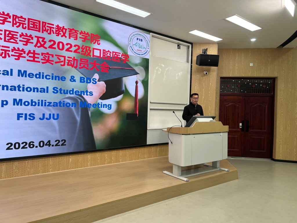4月22日,国际教育学院在竞知楼阶四教室举行2021级学生实习动员大会。副院长朱小晶、临床医学院教师王彬等出席会议,150余名国际学生参加大会。会议由白等田主持。